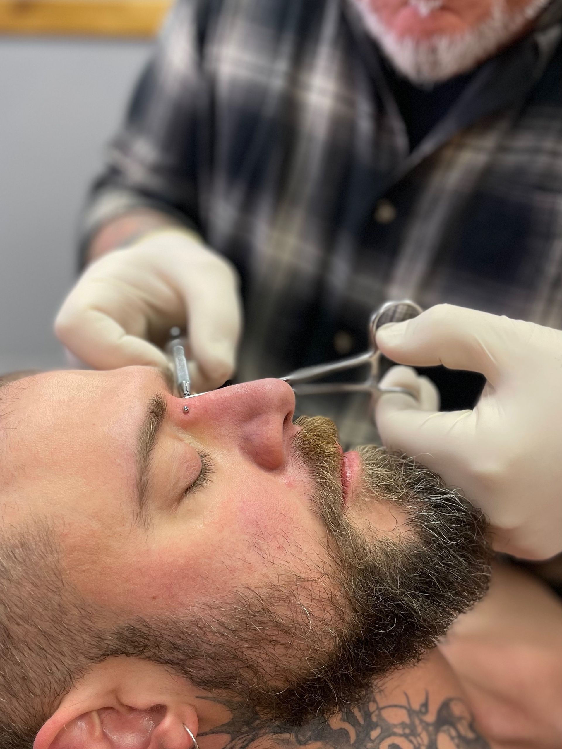 A seconda del tipo di piercing, il piercer utilizza un ago, un biopsy punch o un altro strumento per praticare il foro Inserisce il gioiello.